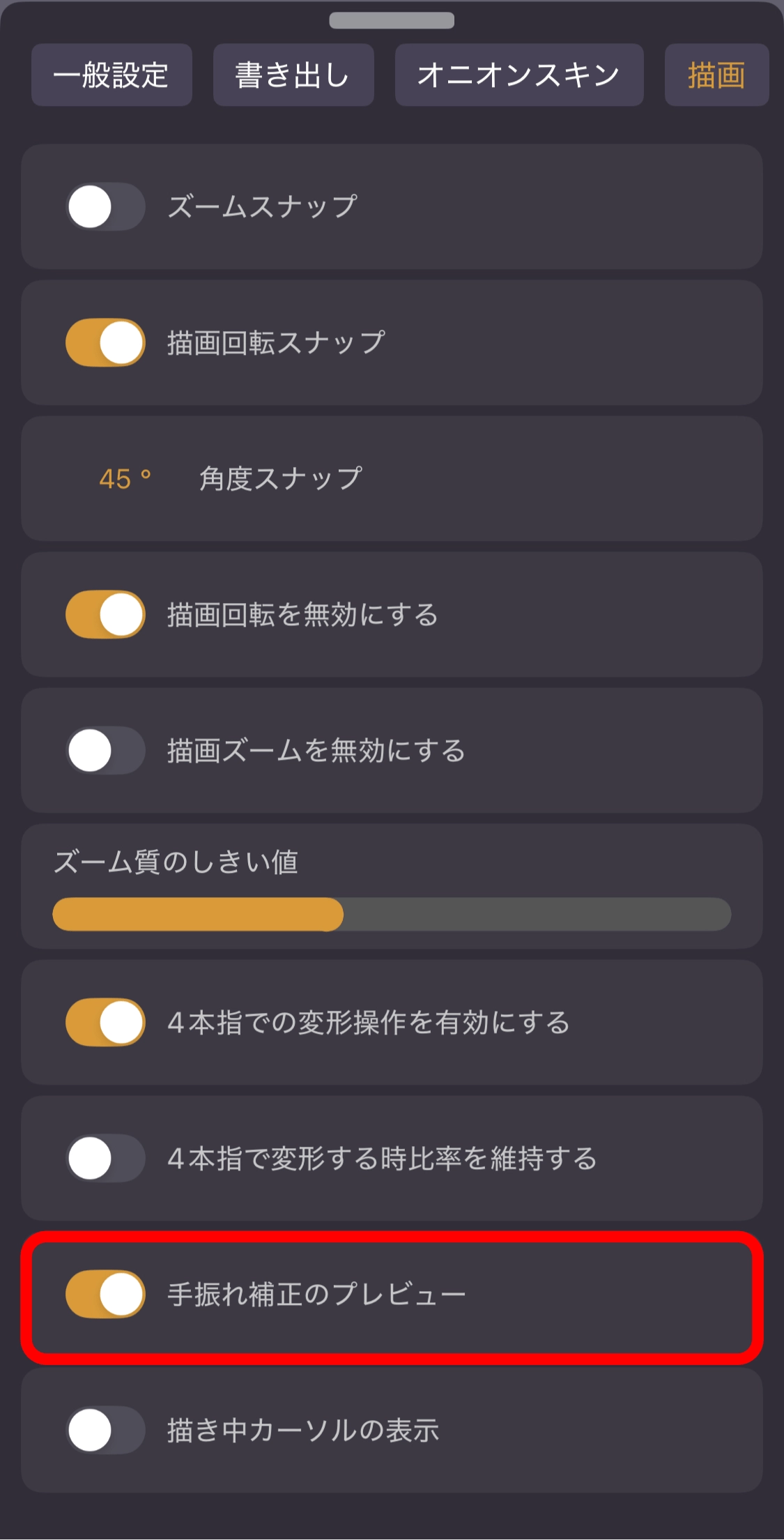 手振れ補正のプレビューをペンストロークと一緒に表示するには、設定>描画タブを開き、「手振れ補正のブラシプレビュー」オプションを有効にします。