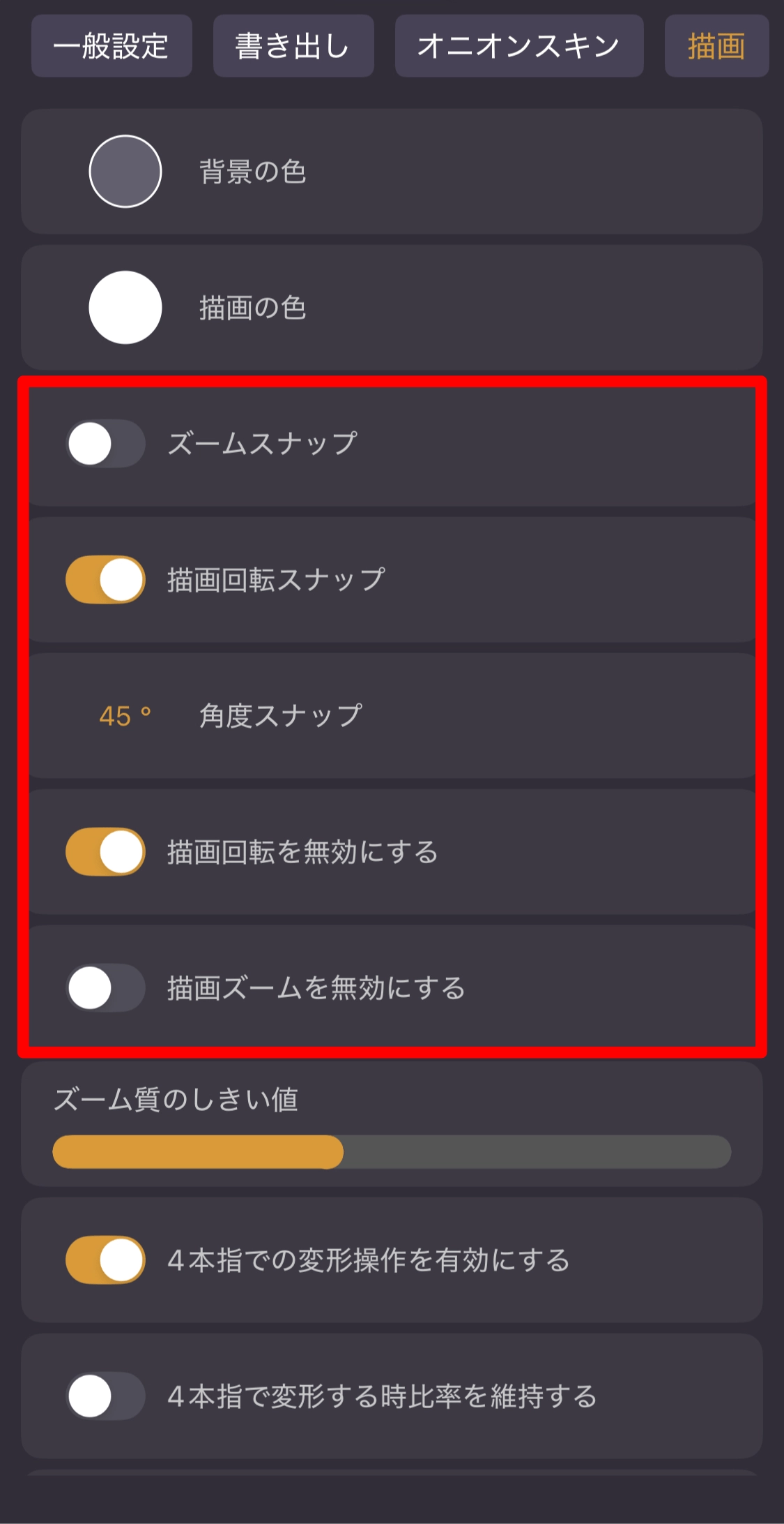 4本指での変形操作を有効にするには、設定>描画>「4本指での変形操作を有効にする」をタップします。