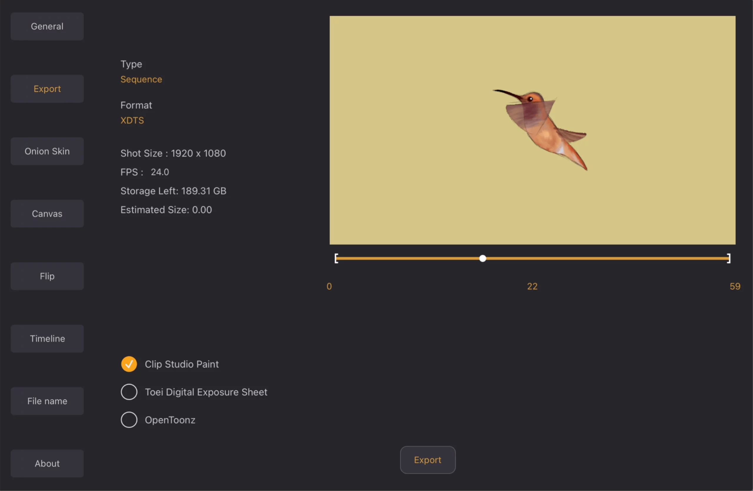 XDTSファイルを書き出しすると、画像とカットの情報を保存します。XDTS形式を対応するソフト、Opentoonz とClip Studio Paintで読み込むと、カットのレイヤー構造とタイミング情報を回復することができます。